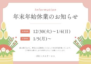 年末の大掃除はお早めに! ●営業時間 8:30~17:00 ●休業日 土・日曜日・祝日 朝... 続きを読む